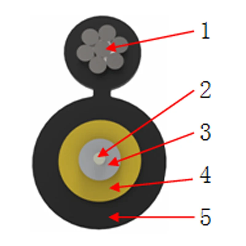 Il cavo a goccia rotonda in fibra ottica autoportante è composto da una fibra ottica tamponata a bassa, che è coperta da filo aramidico ad alta resistenza, un elemento di rinforzo in metallo è attaccato all'esterno e infine uno strato di materiale della guaina è schiacciato su di esso.